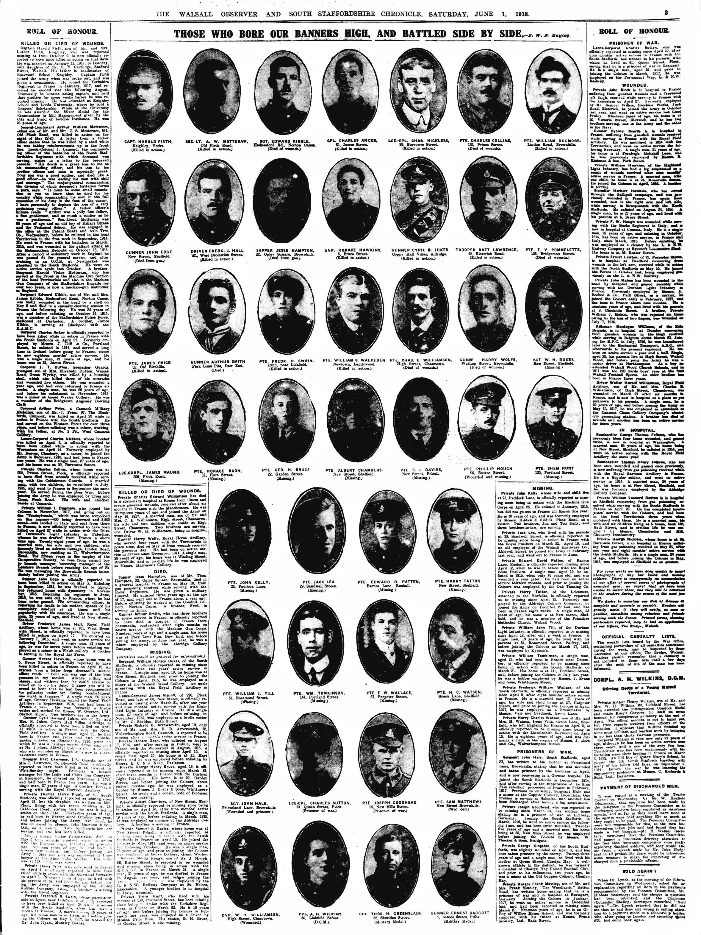 Page from the 1st June 1918 edition of the Walsall Observer and South Staffordshire Chronicle. The announcement of Jesse’s death is in the second column. Jesse’s photograph is in the 2nd row, 3rd in from the left.